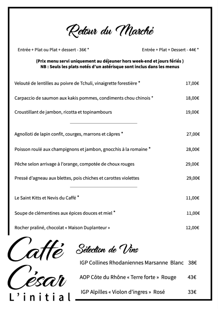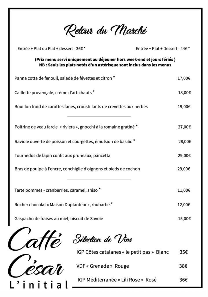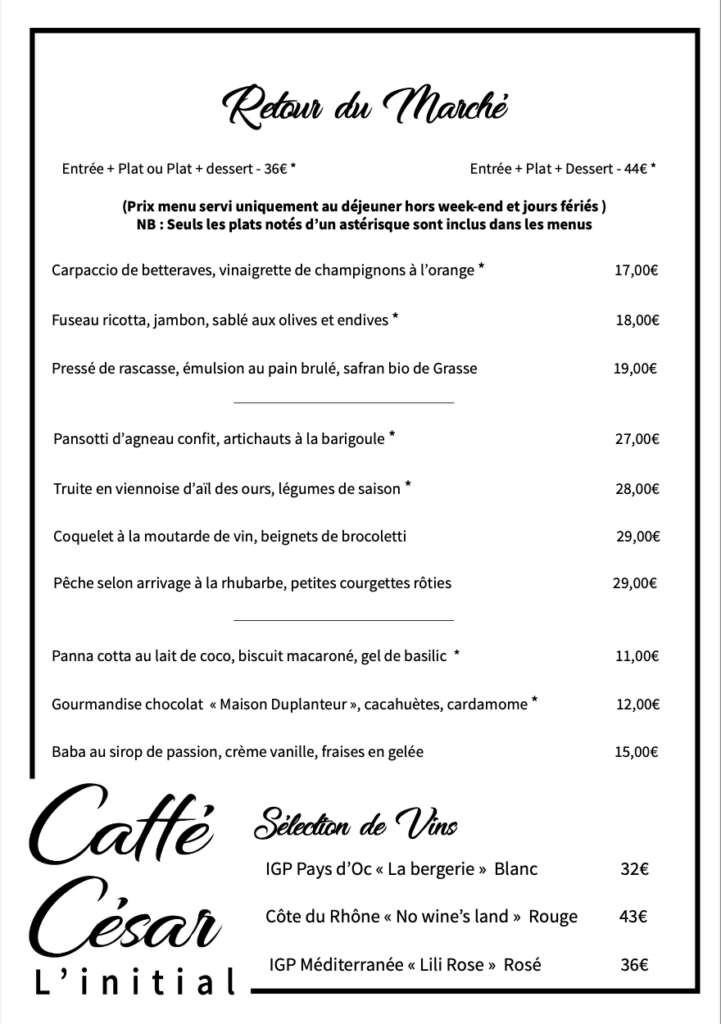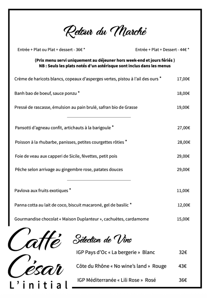 Au coeur du village d’Opio dans l’arrière-pays, un espace de 120m2 et une grande terrasse ombragée vous accueillent à la brasserie du Caffé César. Deux Chefs Thierry Molinengo et Fréderic Bogé accordent leurs talents. Sur le piano de la cuisine se joue un concert à quatre mains à la vue de tous afin de vous permettre de vérifier l’authenticité de leur cuisine. Un service en continu pour découvrir et savourer les plats emblématiques de la cuisine méditerranéenne. L’intention est d’offrir une restauration traditionnelle de qualité, à base de produits locaux dans un cadre convivial. Mais également de contribuer au dynamisme du nouveau quartier du village d’Opio, devenir un lieu d’échanges, de rencontres et accompagner tous les évènements festifs du village et autres manifestations.